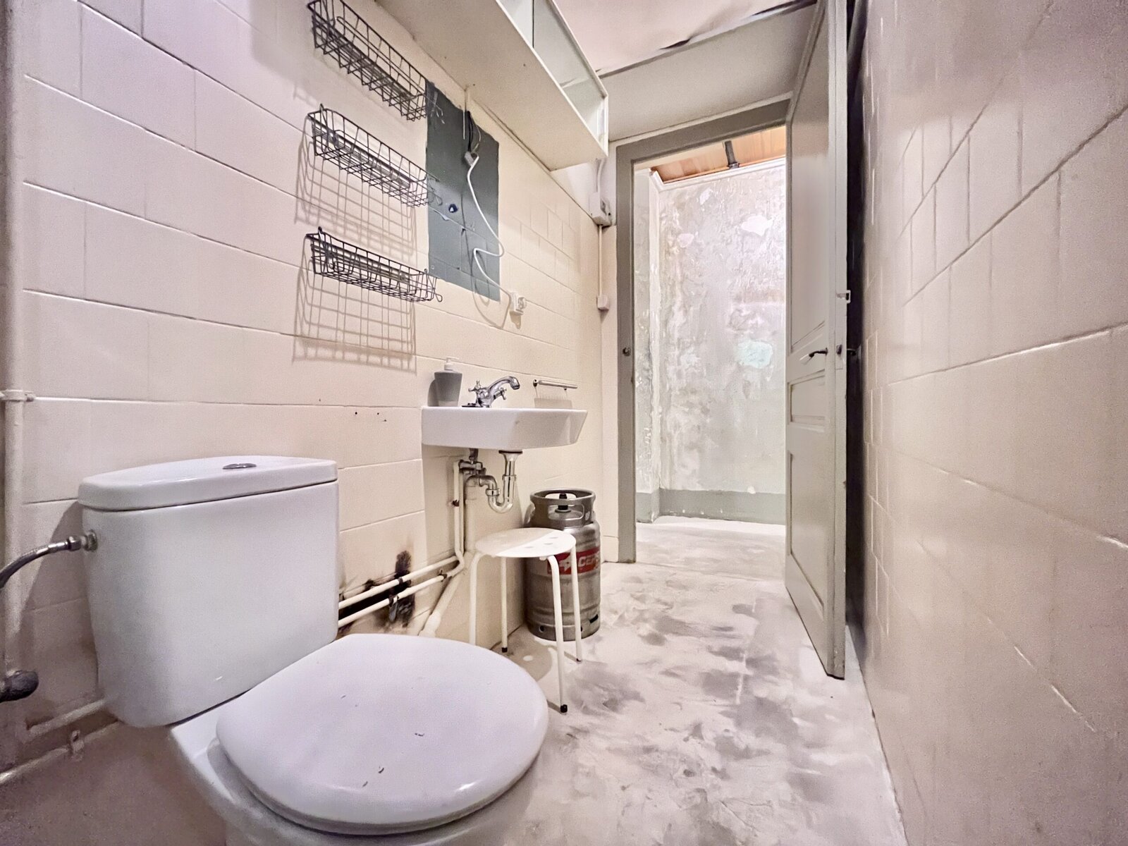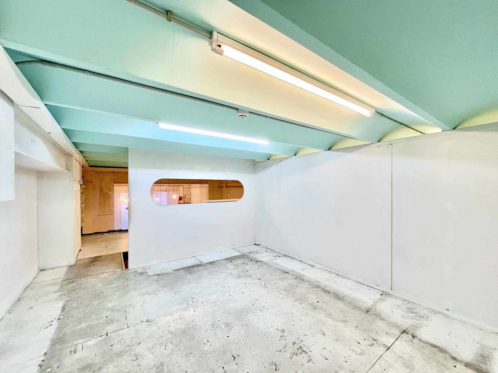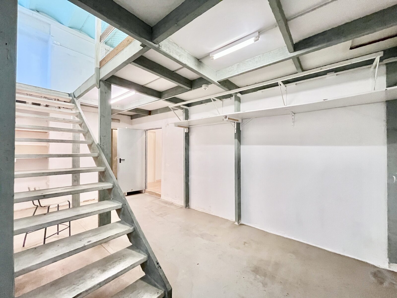 It comprises a large, open-plan street-level space of 70 m² with parquet flooring, a reception area, four large interior rooms, three smaller interior rooms, a rear patio of approximately 10 m², two restrooms, and a 40 m² mezzanine.