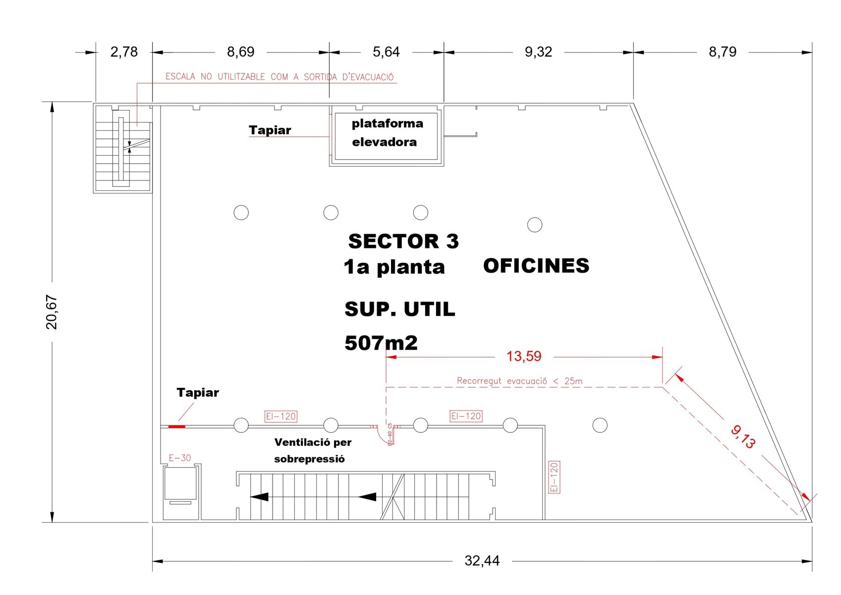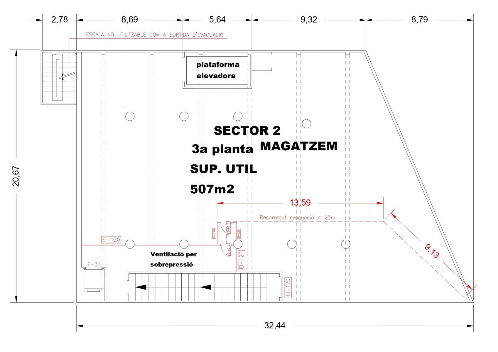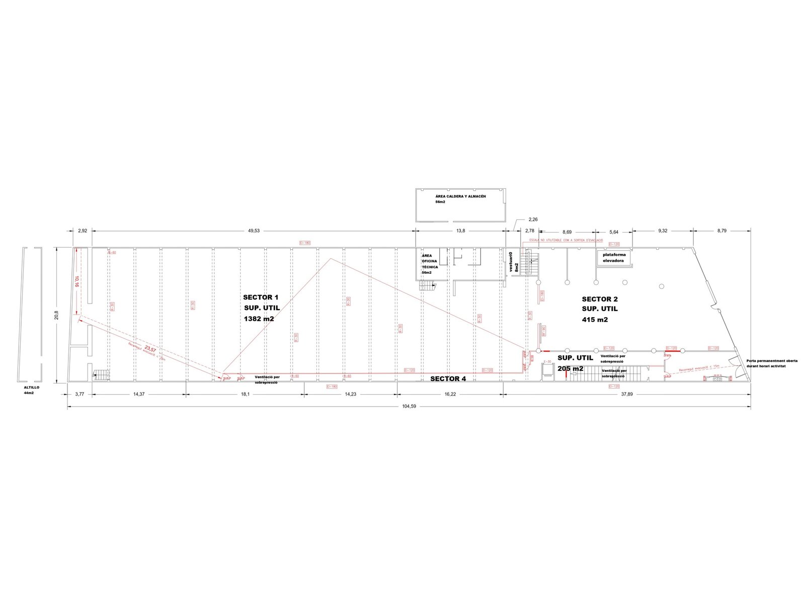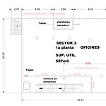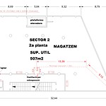La nau compta amb tres plantes superiors totalment diàfanes de 583m² cadascuna i un soterrani de 653m².